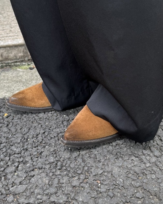 それに合わせるパンツの光沢のある真っ黒とブーツの茶色のスエードも