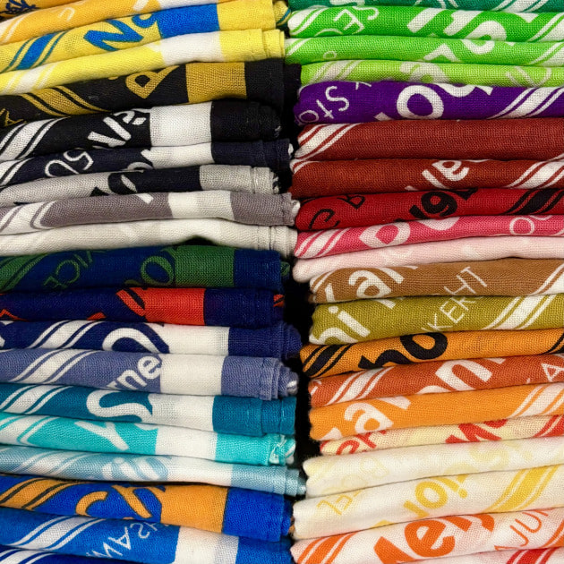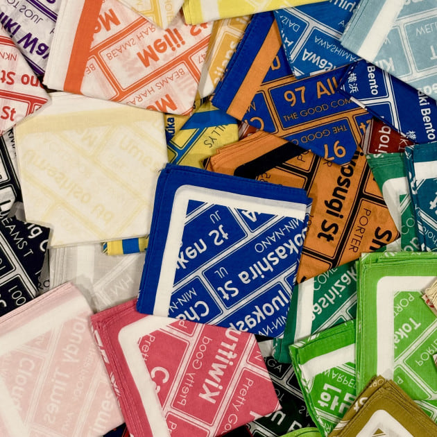 お店ごとに色が異なり、基本的には同じ色は存在しない。また、そこには「土地」のローカルに根差した「意味」があります。「なぜこの色なのか?」「文言とお店はどんな関係があるのか?」と紐解いていく作業がとても楽しく、一枚のバンダナを通してその土地を旅しているかのような不思議な感覚になります。