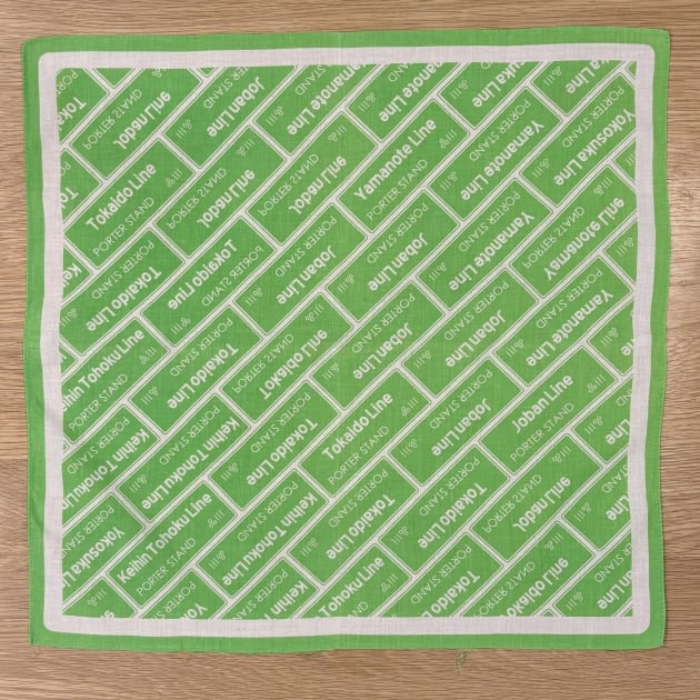 続いて、2018年に品川の「PORTER STAND」で発売されたライトグリーンカラー。山手線のカラーをサンプリングし、品川駅を通る路線名を取り入れたバンダナ。