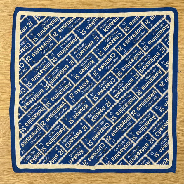 まずは2014年に発売された「MIN-NANO」オリジナルバンダナのブルーカラー。青い道路標識のカラーをサンプリングし、ショップへ向かう主要な「道」を取り入れたバンダナ。