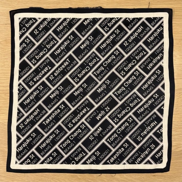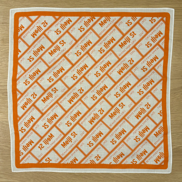 続いて、2016年にビームス創業40周年のタイミングで周年商品を販売した際にノベルティで配布していたビームスオレンジカラー。店舗が面する「明治通り」を記したバンダナ。