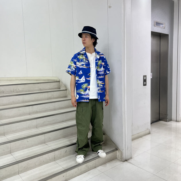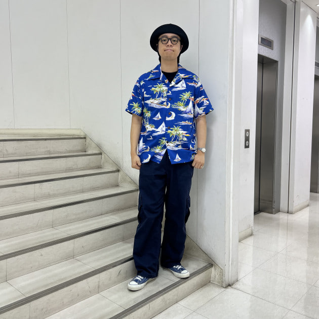 私はアロハシャツを引き立てるようにブルー系の同系色で纏めてみました。