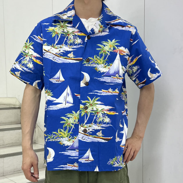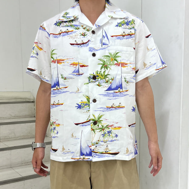アロハシャツといえばレーヨン素材が用いられることが多いですが、こちらはパリッとしたコットンポプリン。非常に軽く、特有の光沢感があり着心地も良いです。また、レーヨンに比べ扱いやすく、洗濯などもしやすい点も魅力的ですね。着込むことで経年変化を楽しむこともできるかと。是非、店頭でお試しいただきたいです!