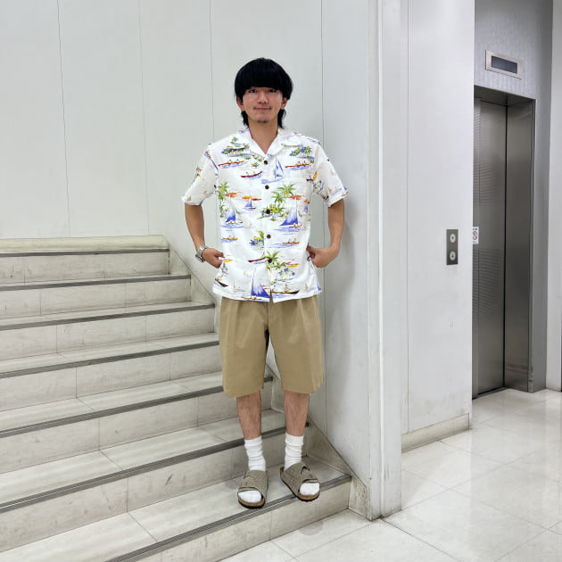 広島店メンズ最年少のスタッフテンガン。チノショーツにサンダルを合わせてリラックスムードのあるスタイリング。