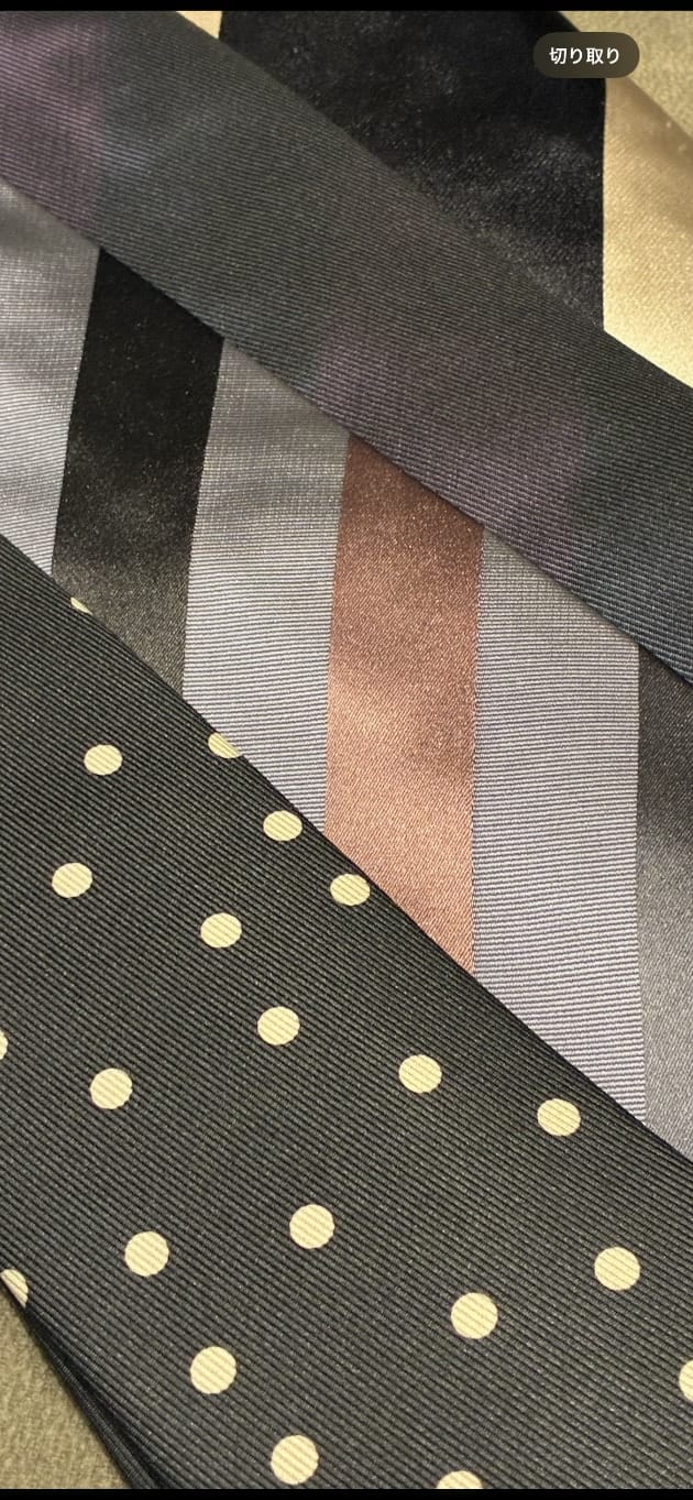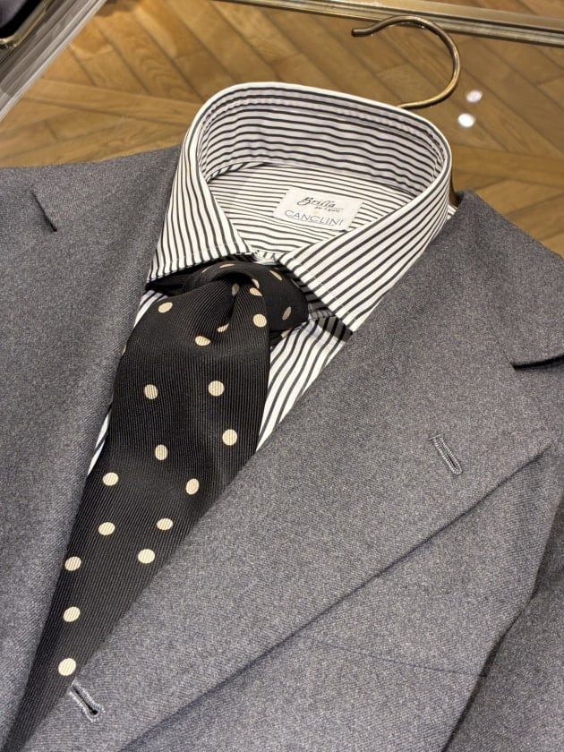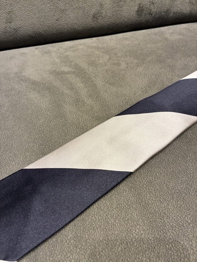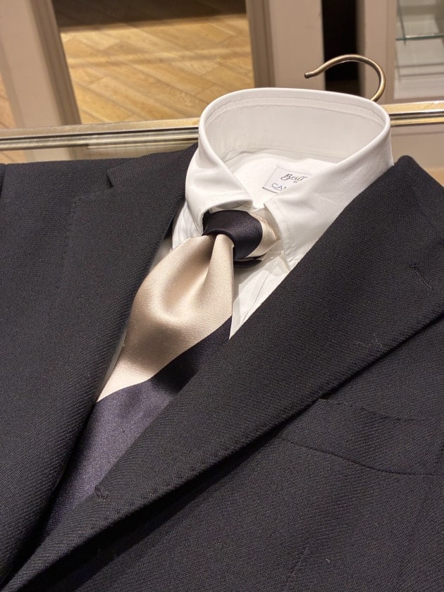 〈Stefano Cau〉のブラックとシルバーの段落ちタイです。一応色表記はシルバーですが、淡いベージュに近い色味。ここ最近サテンのネクタイで崩すのが気分です。