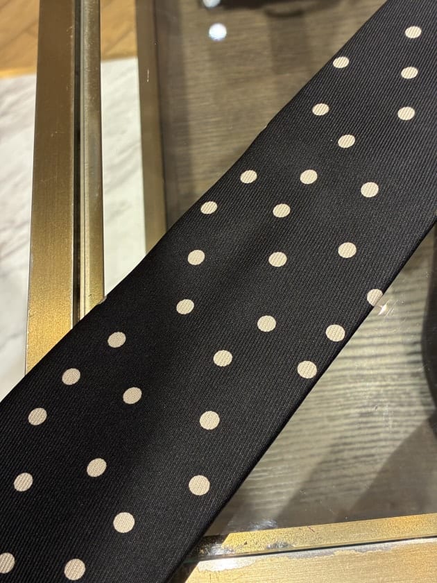 ベースはブラックでベージュのランダムドット。定番ですが少し捻りのある柄です。