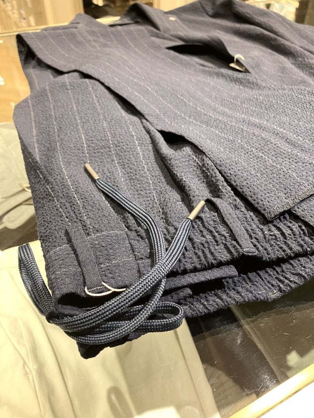 まずこちらは、シアサッカー地のネイビーストライプのセットアップです。