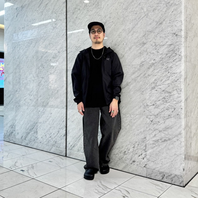 オールブラックで統一したコーディネートです。