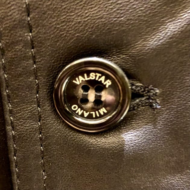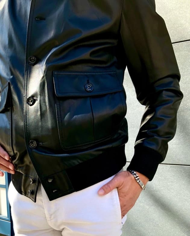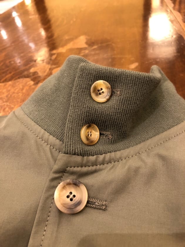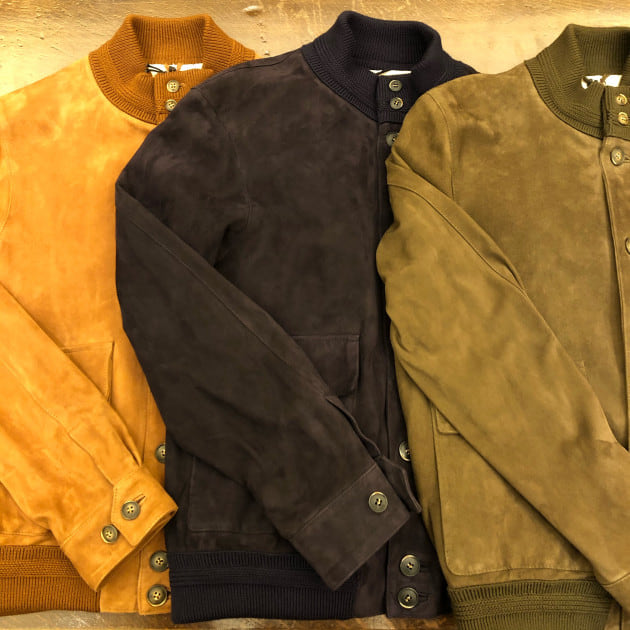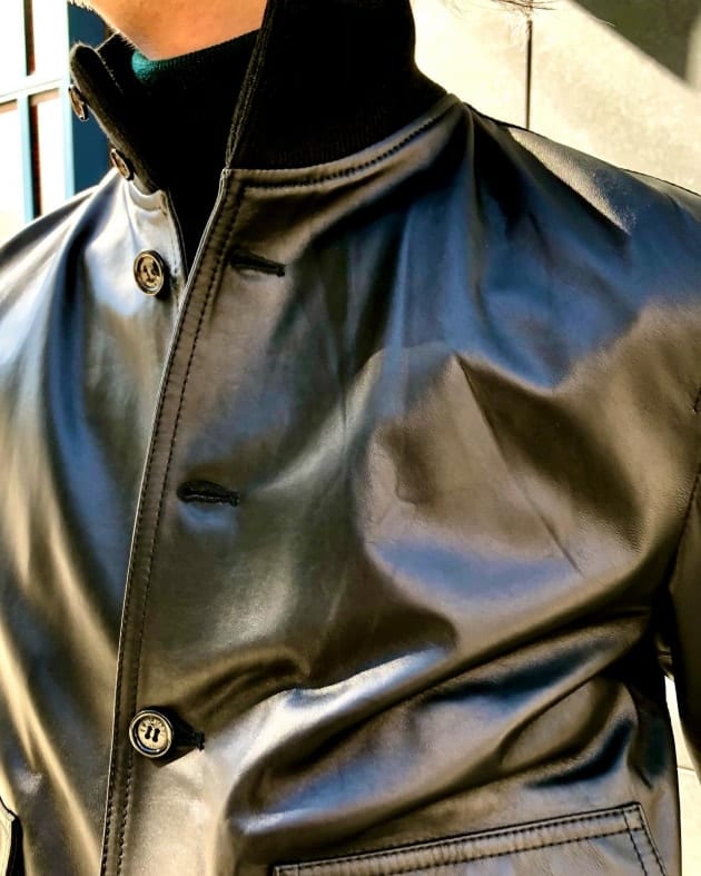 ブラックスウェードのレザーにバーガンディの裏地。ボタンはブラックのホーンボタンで色艶あるモダンな印象になるブルゾンで組み合わせました。