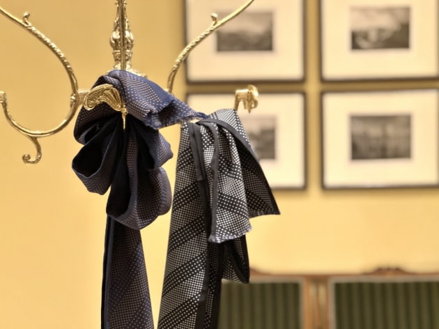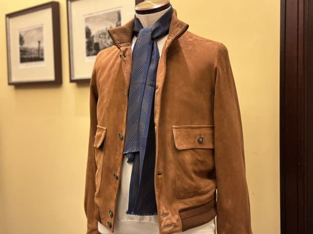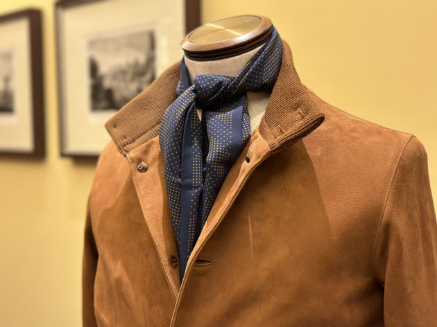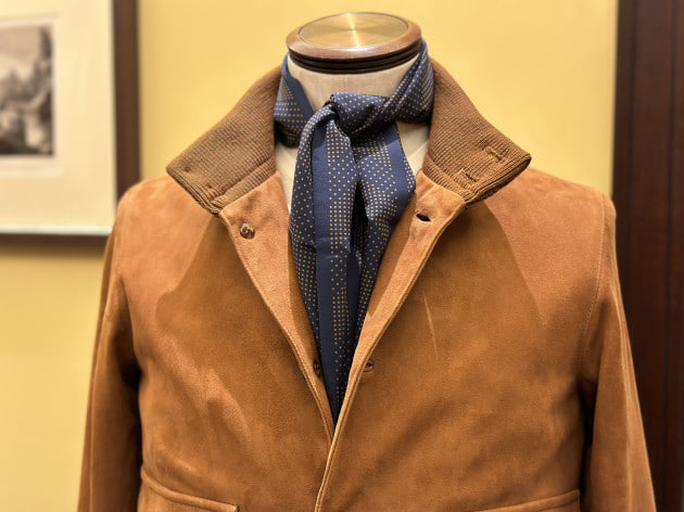 プリントのレジメンタルタイと、ジャケットの素材感を考慮してスウェード。エレガントな装いには装飾のタッセルがセオリー!