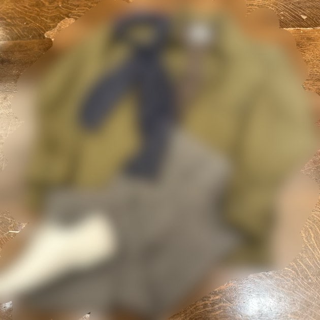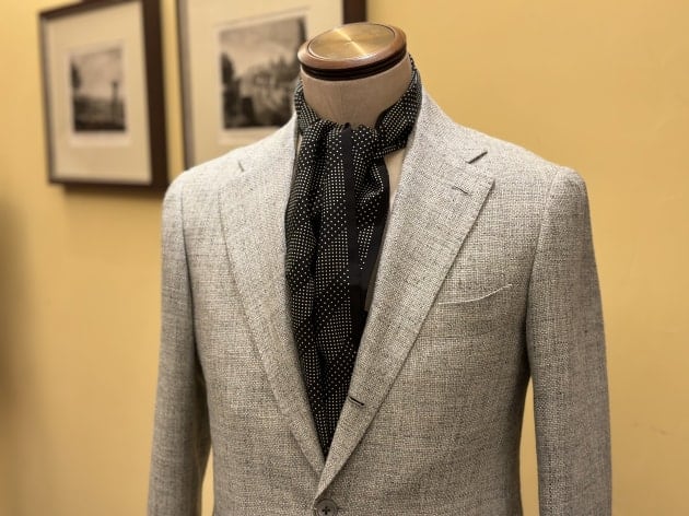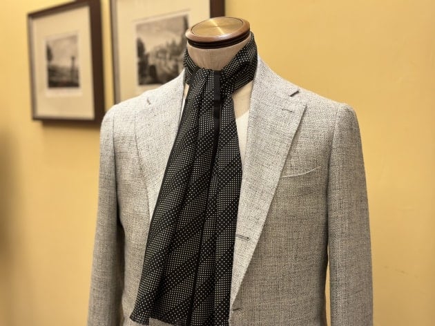 色目が素敵。やや淡〜いグレージュ。ジャケットの水牛ボタンの色とさりげなくリンク。そして燈である、▼Scarf