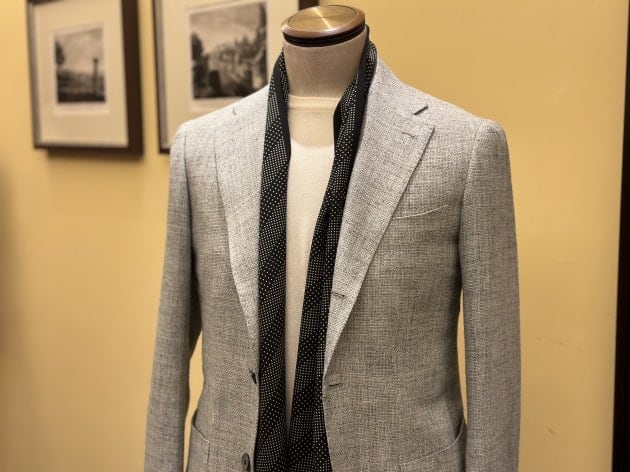 イタリア生地、<E.THOMAS>社のウール×シルク×リネン。 夏に重宝する殿堂入りの3者混!軽くて、涼しくて、シワになりにくい。最高ファブリックです!続いて、