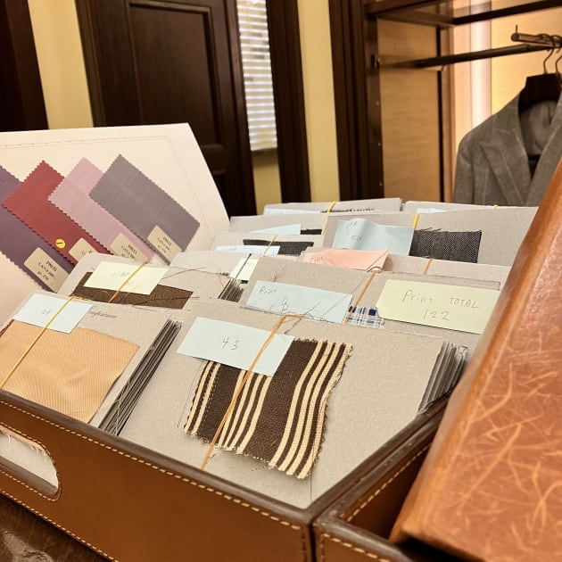 シルクネップ(シャンタン)と、メランジ生地のコンビネーション。スポーティな段落ちネクタイも生地に表情があることでグッとエレガントな仕上がりです。