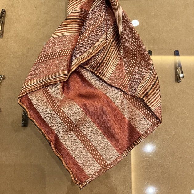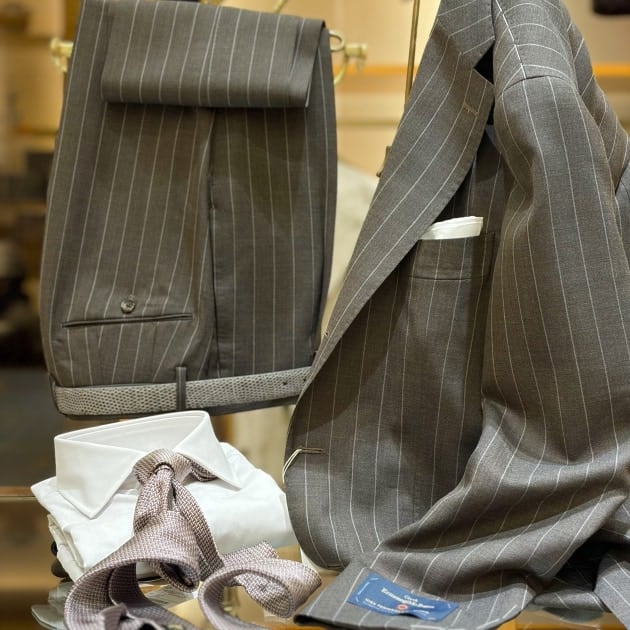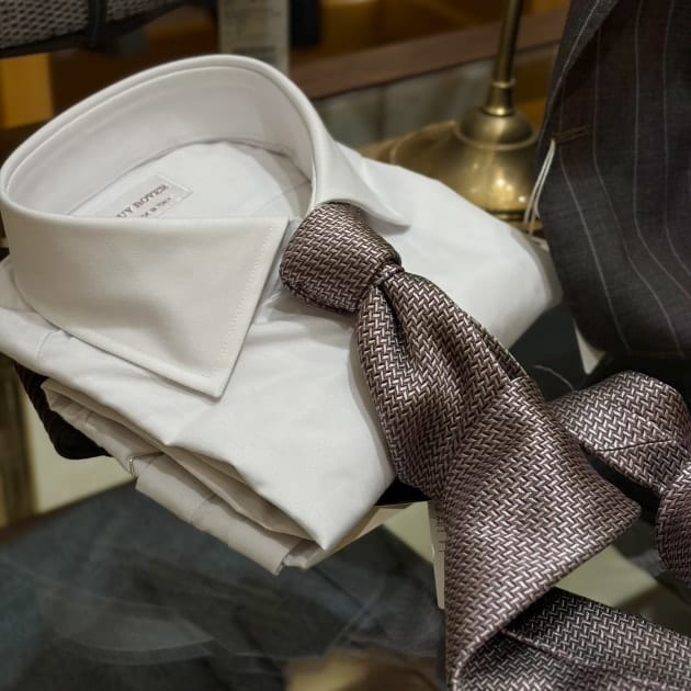 こちらのネクタイは、私の中では古き良きクラシコを象徴する柄だと感じております。継承してブラウンスーツで!