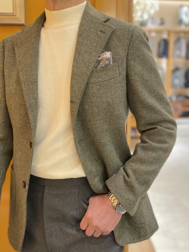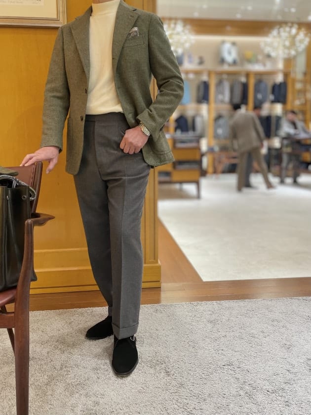 ブラウン系統のアイテムの中に、違う暖色を差すと野暮になり過ぎず、良い塩梅に馴染みます。
