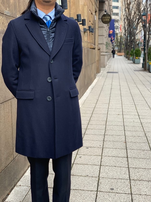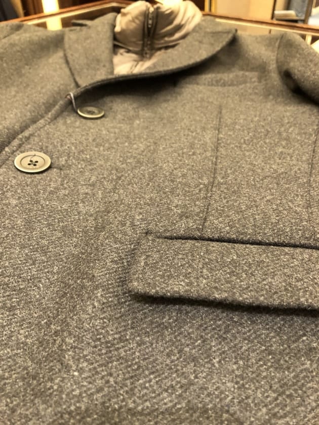 背中にはダウンを忍ばせたPコート型ダウンジャケット。