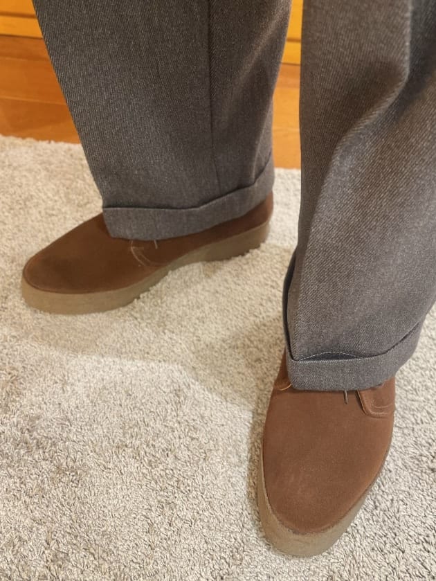 足元は今シーズンご予約でお求めの〈SANDERS(サンダース)〉のスエードチャッカブーツ。