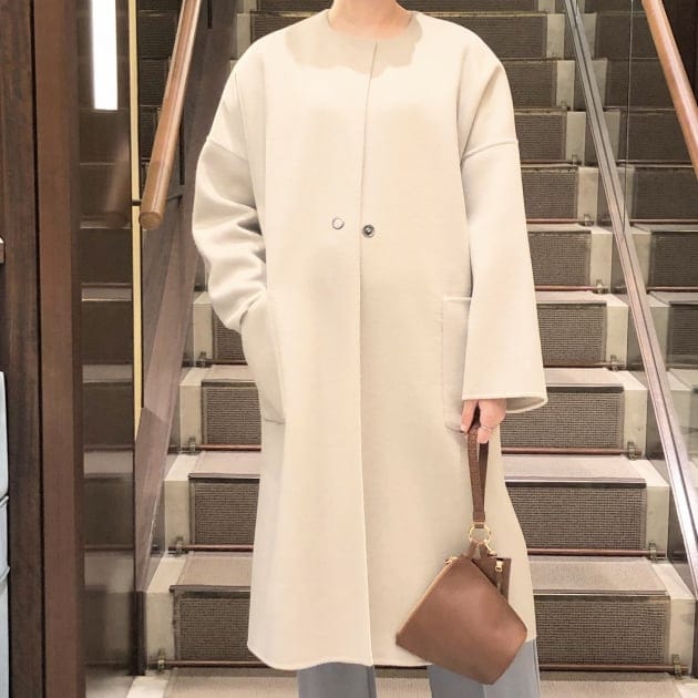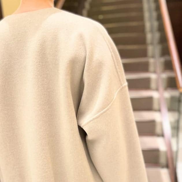 ON/OFF兼用で着用しやすいノーカラー。
