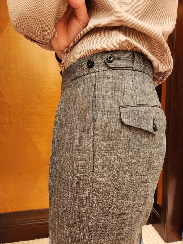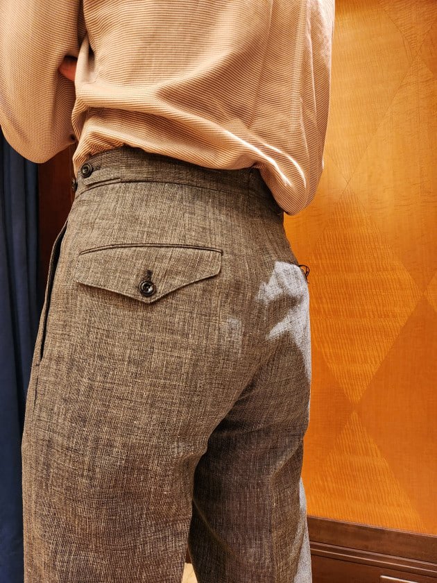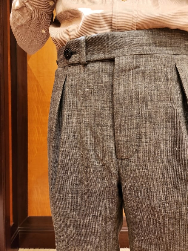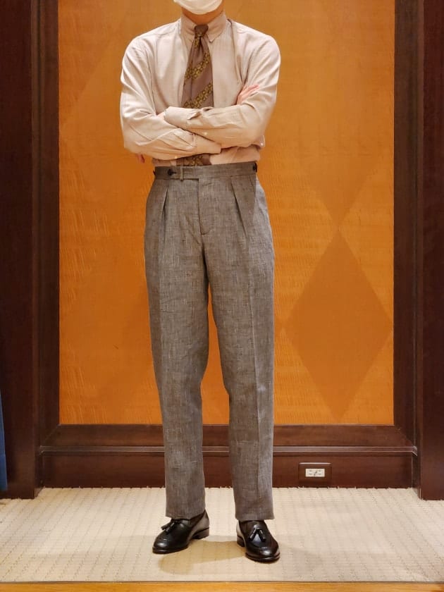 ブラウンのウールフレスコトラウザーズは〈GTA(ジーティーアー)〉のSERGIO。今は展開していないワンプリーツ、ワンダーツの少しだけワイドシルエット。