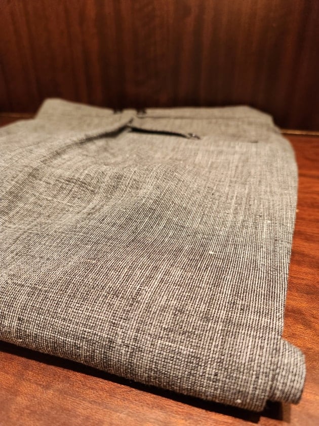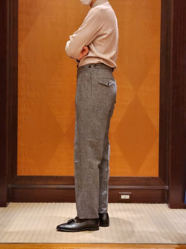 インナーのオレンジのニットポロシャツは〈Cruciani(クルチアーニ)〉。かなり昔のらしいですが、今シーズン初めて出してこられたそう。ゆったり目が今っぽい。