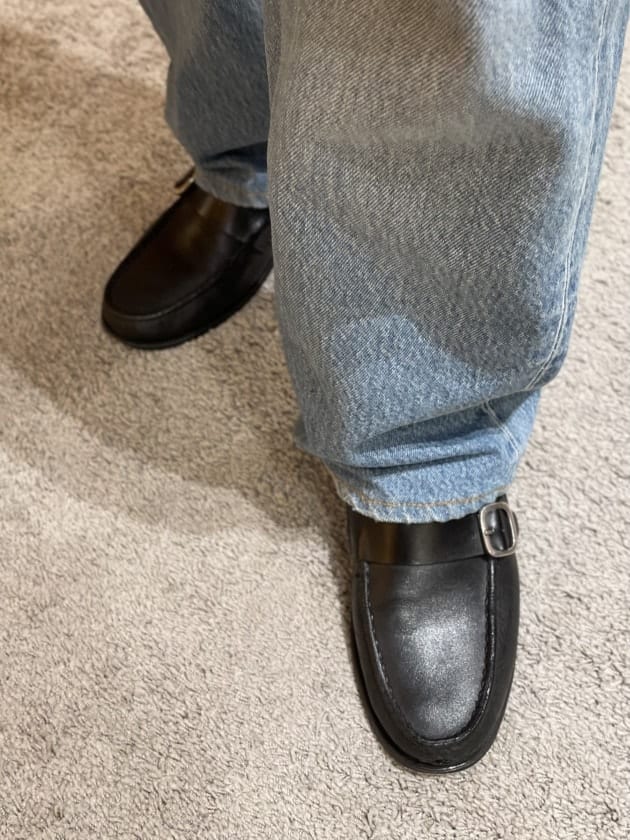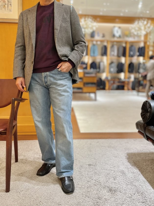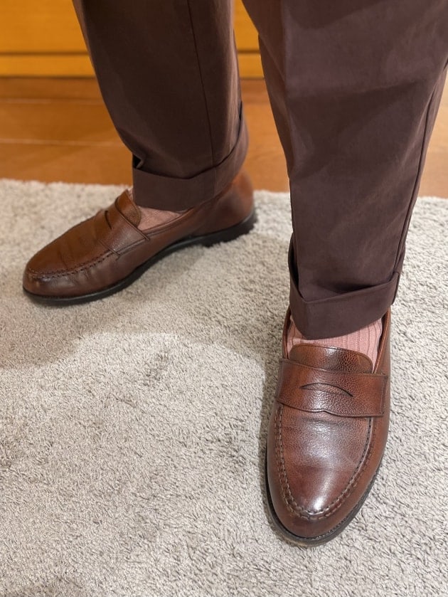 足元は〈GUIDO(グイド)〉のバーガンディストラップローファー。