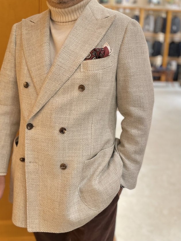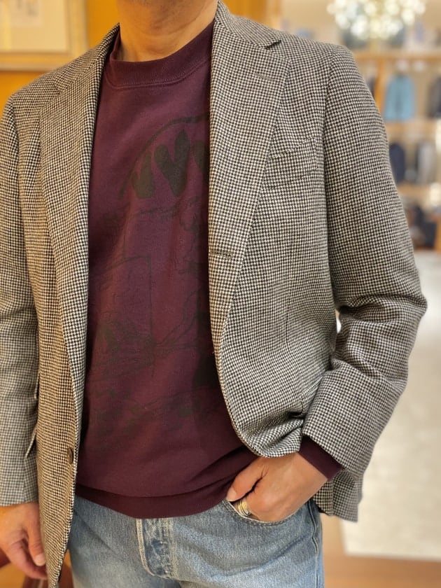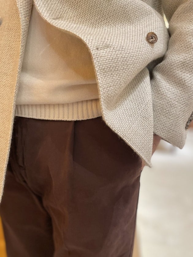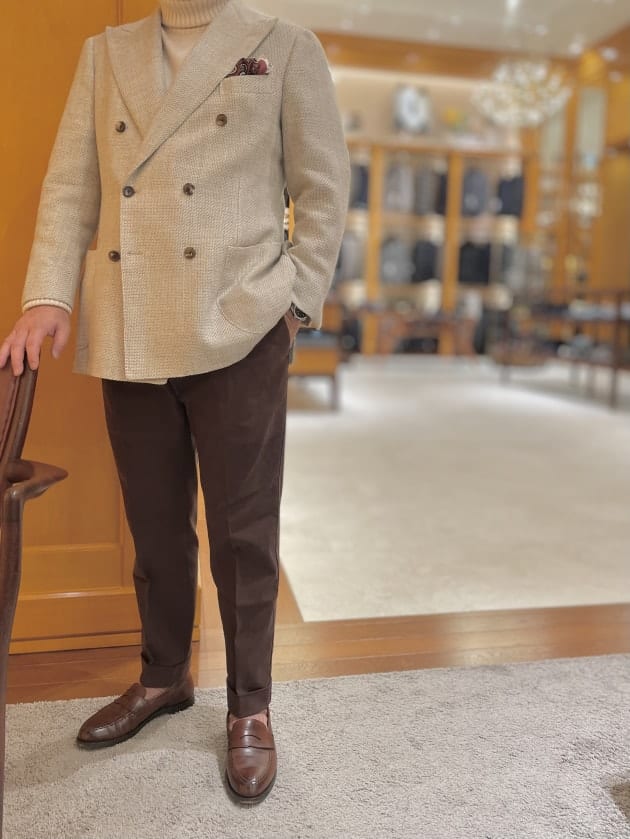 ジャケットはCUSTOM TAILOR BEAMS、シャツは〈ERRICO FORMICOLA(エッリコ フォルミコラ)〉。なんとも難しい合わせですが、T様はさらりと合わされています。