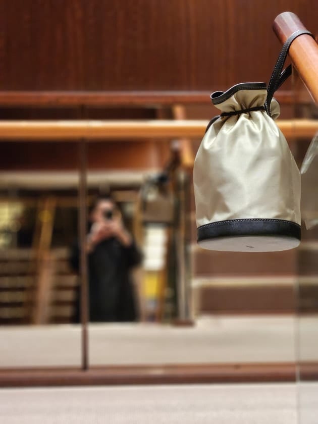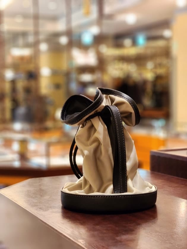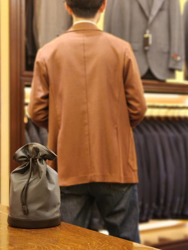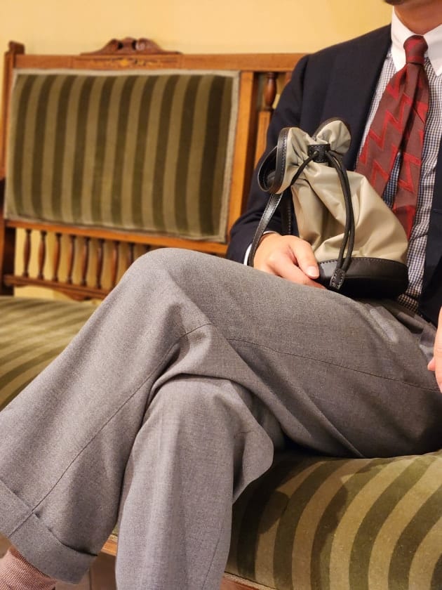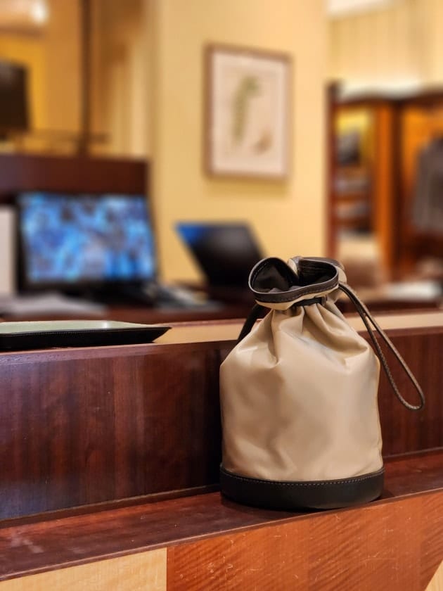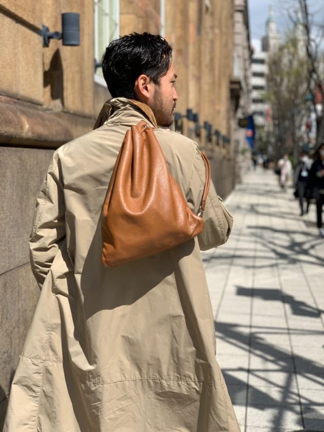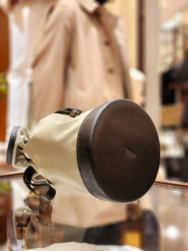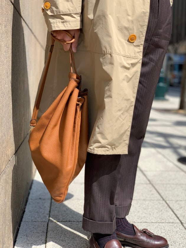 大きい鞄の場合は底に鋲が付いていて、ドスンっていう音と共に床に置けます。しかし、メンズの小さい鞄ってなぜか底が柔らかくて、独立しないことが多いんです。