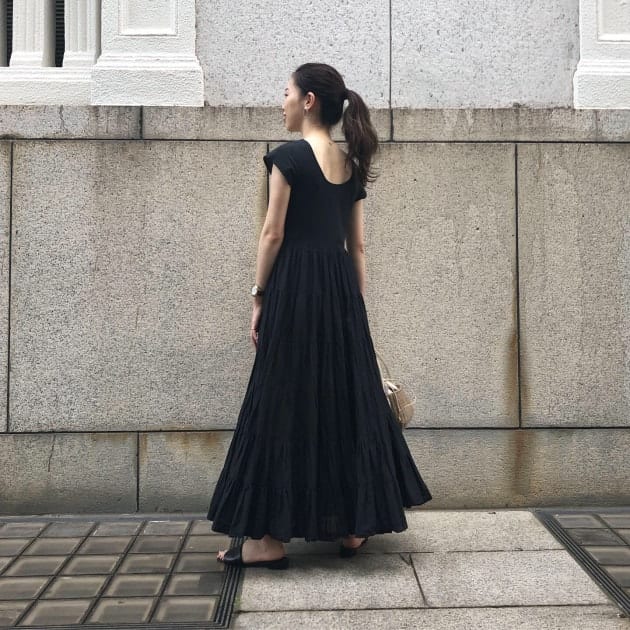黒のトップスであればなにを合わせもいいわけではないのです。やはり夏に黒だと重い印象になりがちなので、首回りは少し開けたボートネックやUネックを選ぶことで顔まわりをすっきり見せてくれます。ここの選び方1つでコーディネートの印象はかなり変わります。