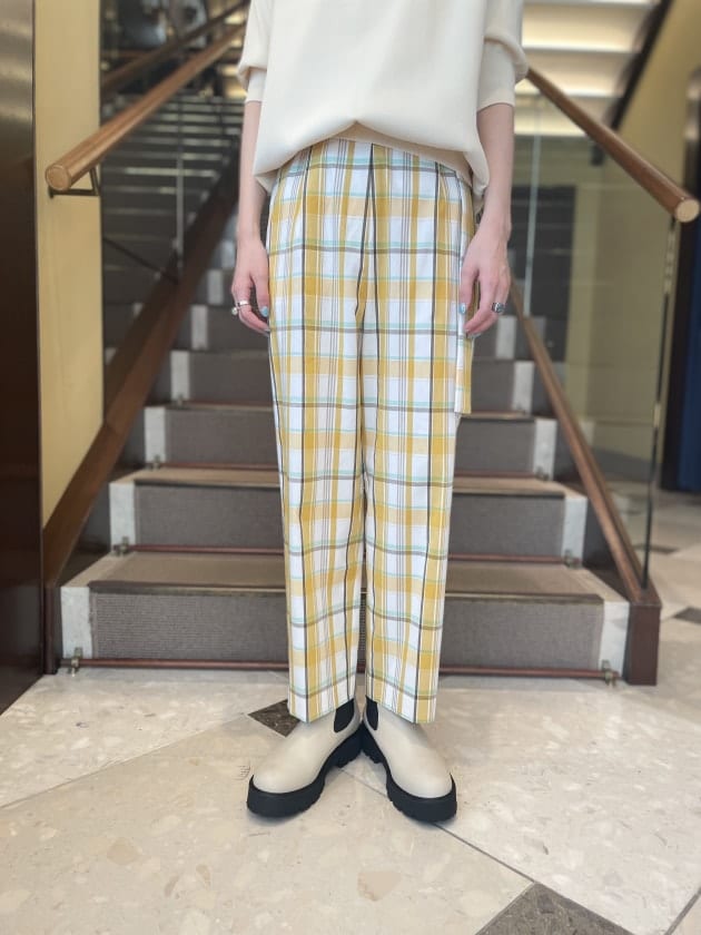 こちらは、ぜひコーディネートのメインアイテムとして取り入れていただきたい<Demi-Luxe BEAMS>のカラーチェックパンツです!