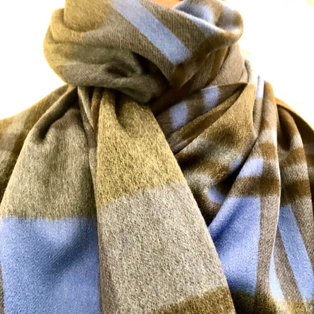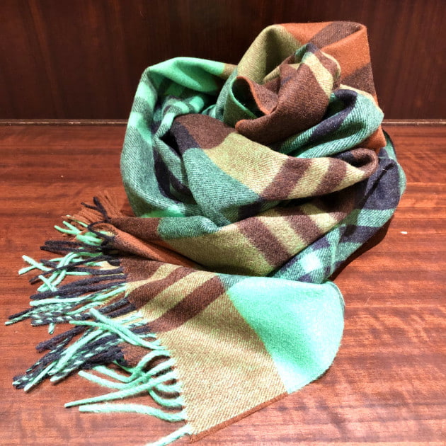 マフラーのおすすめもしておきます。こちらは今シーズンお取り扱いのブロックチェックのカシミアマフラー。ネイビーのコートに対して、色が映えるのも特徴。<Joshua Ellis>の色出しは毎シーズン注目です。