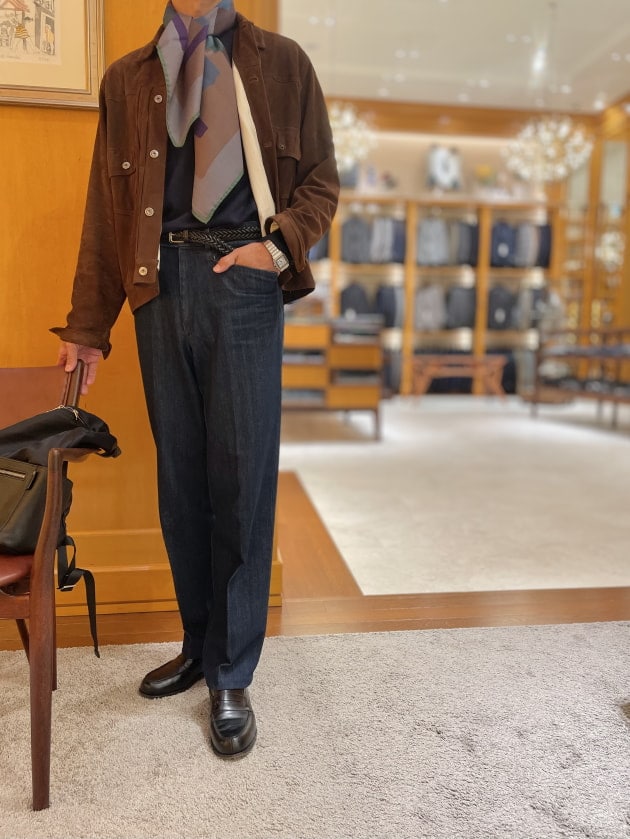 やはりボーダーカットソーは自分の中ではマストで外せません。そこにシルクスカーフを巻いてホワイトのワイドパンツ。足元は<J.M.WESTON>の180ローファー。