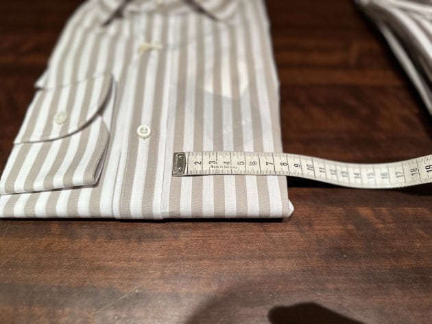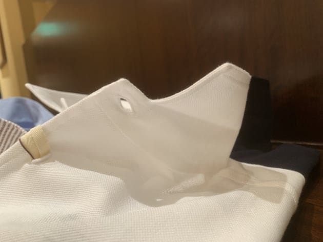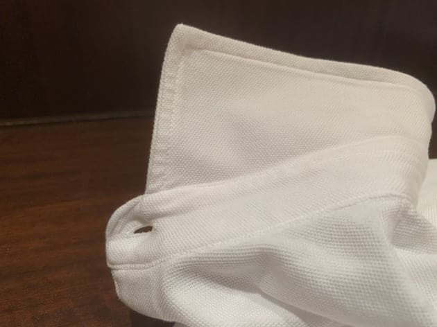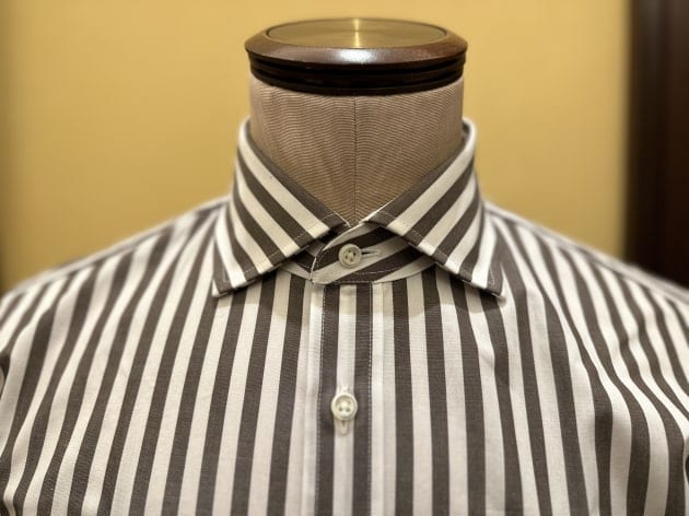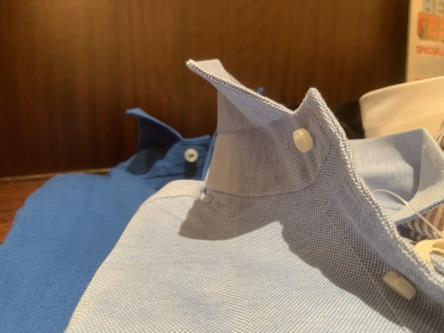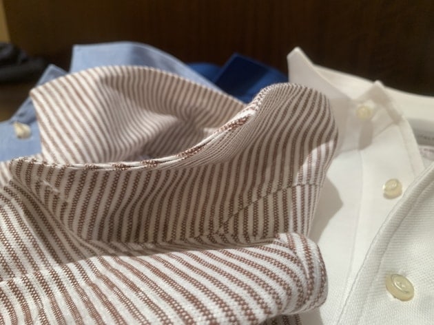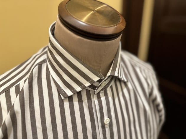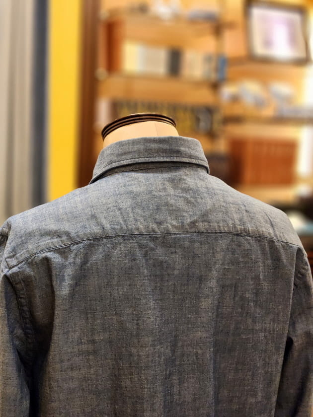 やや小ぶりな襟に台襟が低いのが特徴です。そうすると何がいいのか?