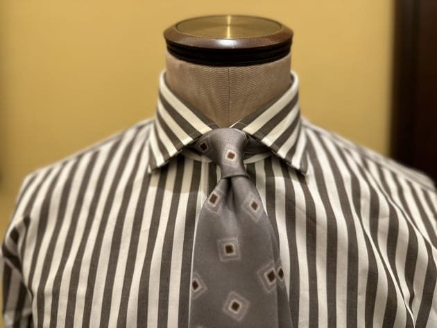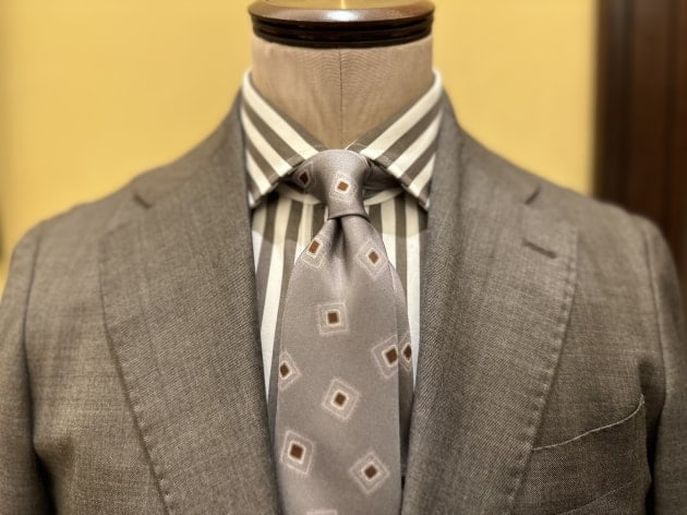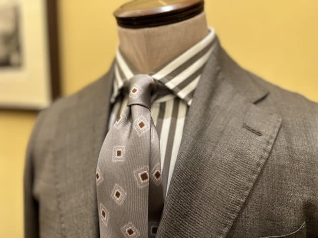 やや小ぶりな襟なのでシングルで結ぶのを推奨。ジャケットありきだと