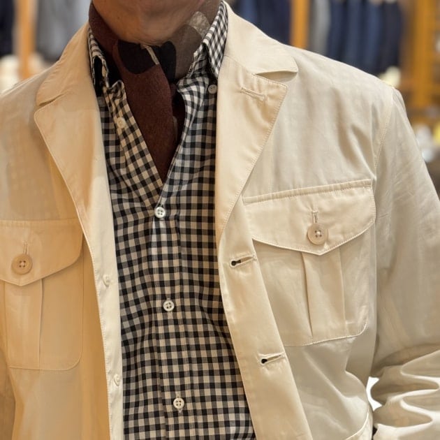インナーのギンガムチェックシャツは〈GUY ROVER(ギローバー)〉。