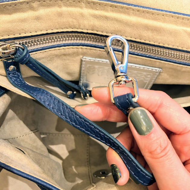ショルダーストラップの留め具はレザーで出来ており、本体の金具にくるりと通してベルトを留める仕様です。