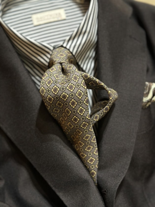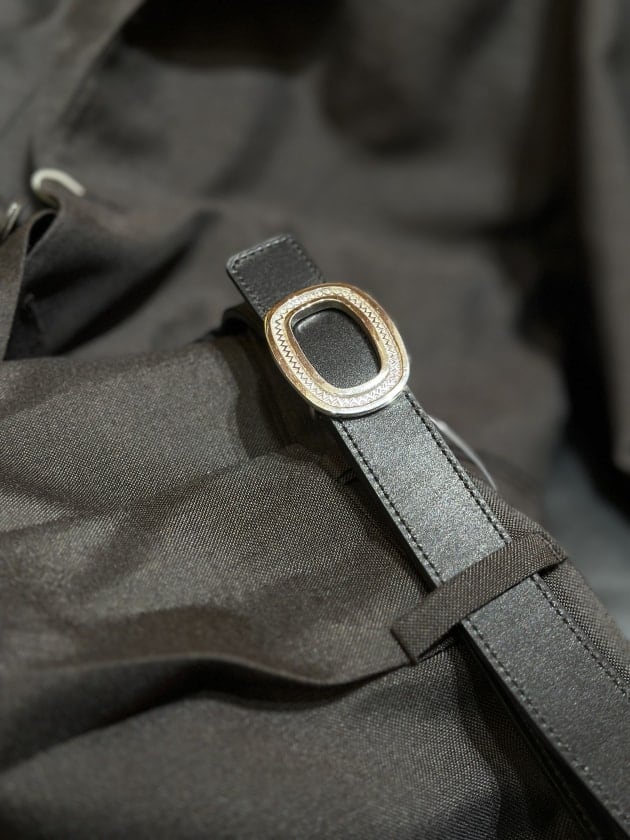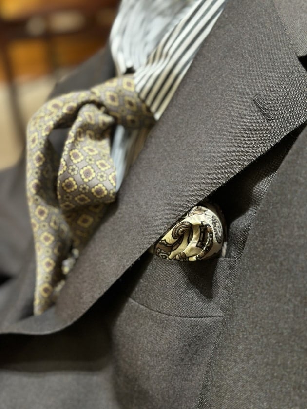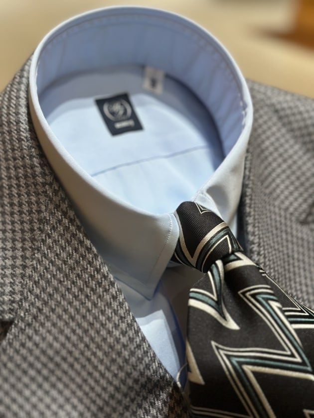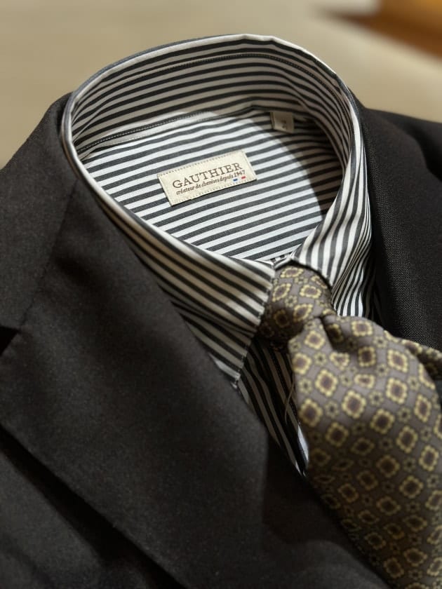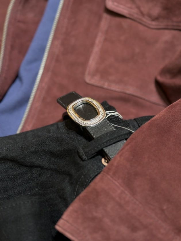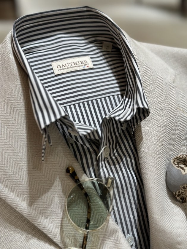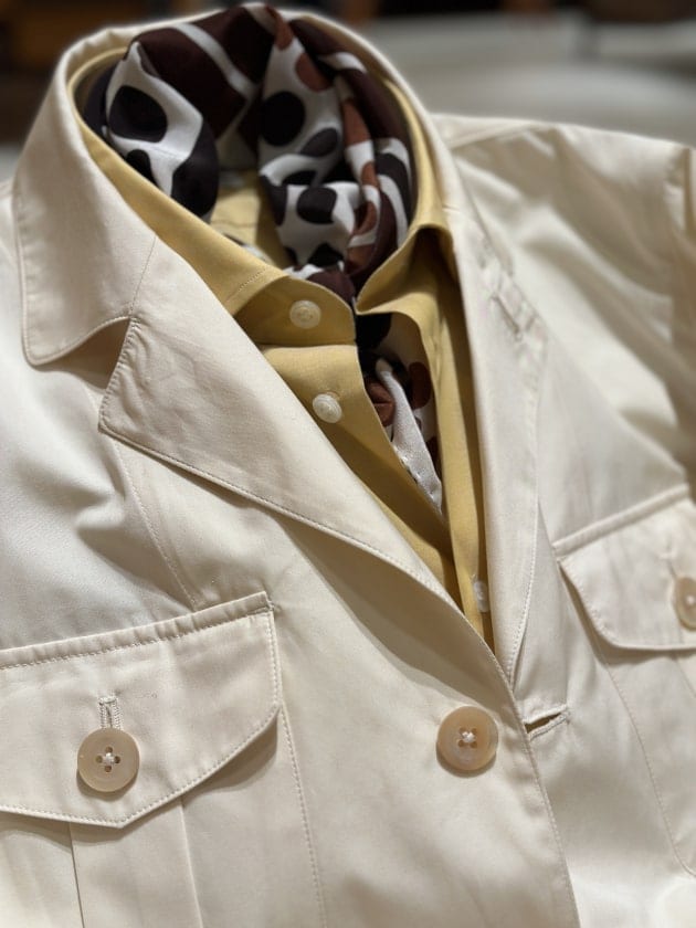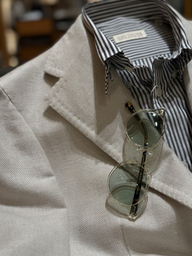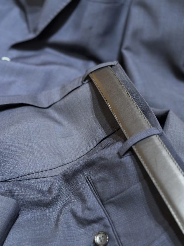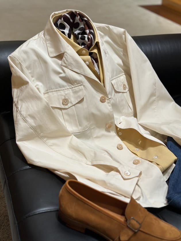 それにレイヤードしているのが、グレーシャンブレーのワークシャツ。小ぶりな襟との調和性、バランスがとても、よく合います。