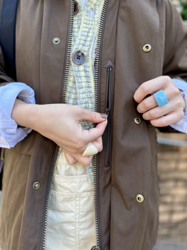 このようにジップを上に持ってきて、しっかりとインナーが見えるバランスにするのも◎