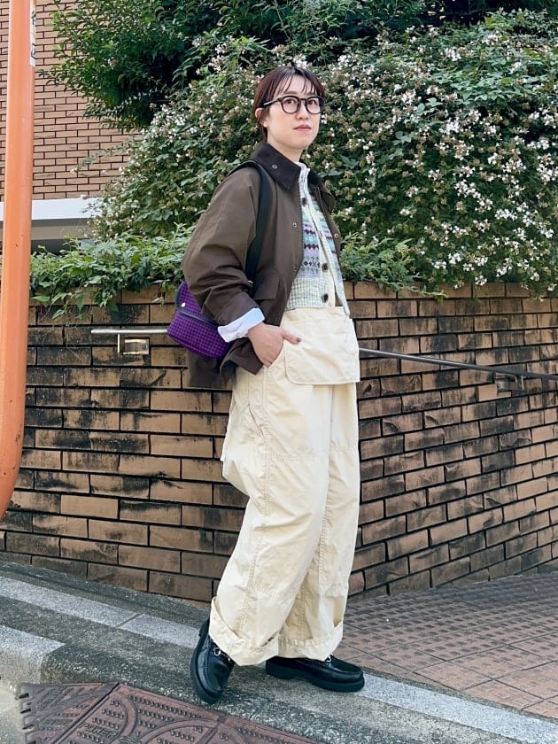 ほっこりとしたアイテムの中に艶感のあるパテントのビットローファーやべっ甲のメガネを入れた所がポイントです♡