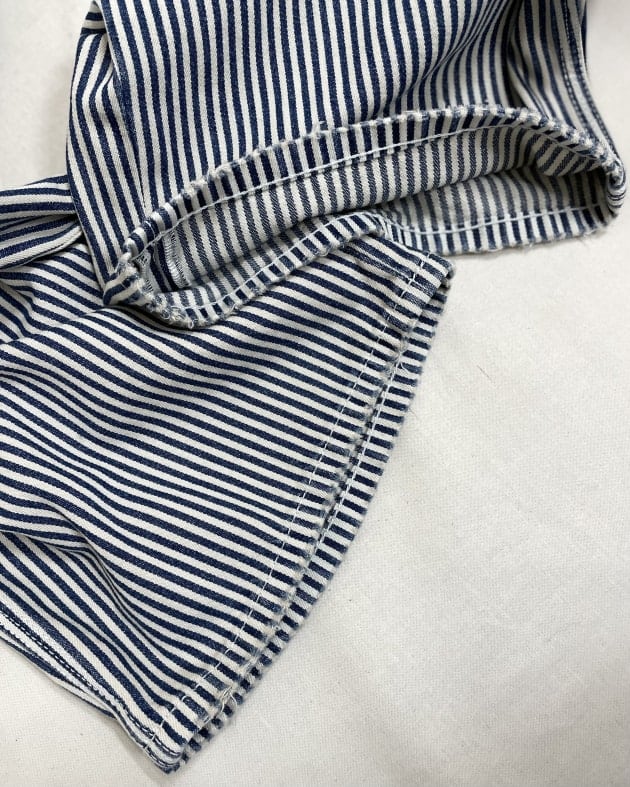 ヒッコリーとは、紺色のデニム生地に白いストライプ柄が入った生地の事です。