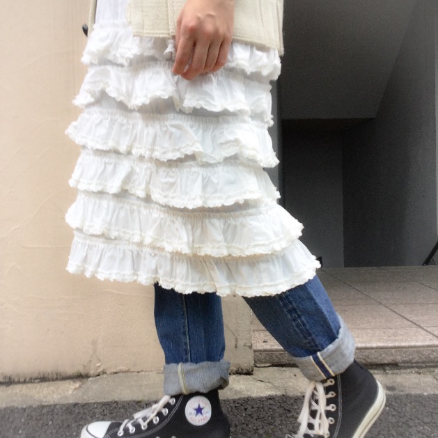 スッキリと開いたネックを利用し、中にフリルシャツを着用。