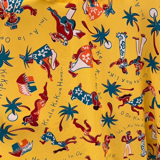 後ろにはフラダンサーやカヌー、ウクレレを弾くビーチガールなど、ハワイのカルチャーと南国の空気を感じる贅沢なプリントです。