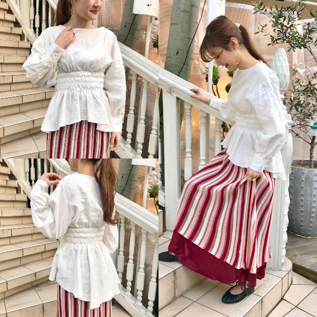 トップスは、ウエストのシャーリングはもちろん、サイドにかけてフレアーな裾もポイント。
