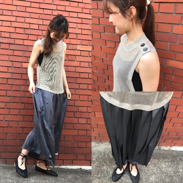 太めのラメ糸で編んだニットに、プリーツ加工したサテンのワンピース。素材感が上品です。また、肩にある大きめなボタンもポイント!