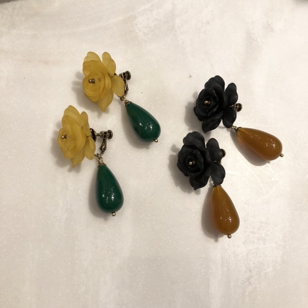 定番のリーフ型にメタルを組み合わせたイヤリング。それと完全デザイン別注のチョーカー。