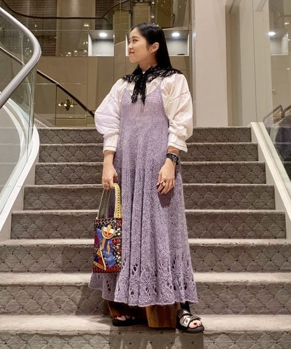 続いては、ジョーゼット生地を使用したガーリーなワンピースとシースルートップスを合わせたスタイリング。