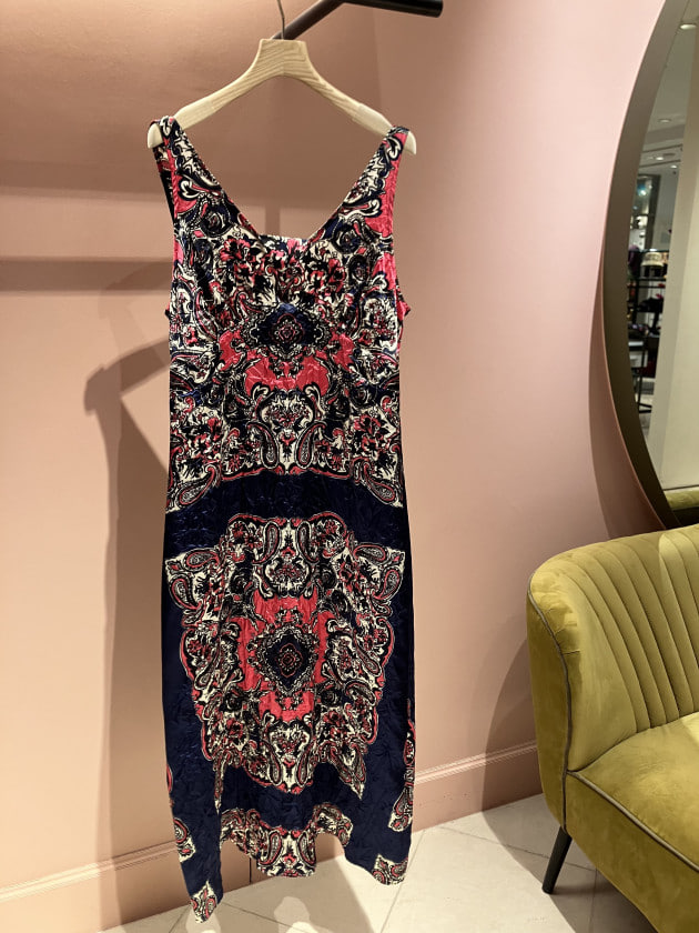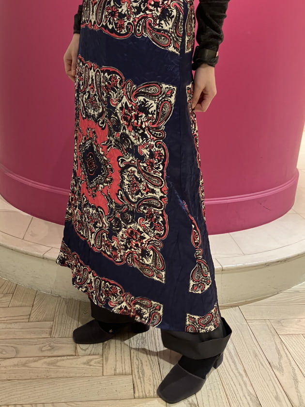 ハンドドローイングだからこその柄が印象深いワンピースです。ネック下、アームのフリルも素敵です♡キュプラの光沢とソフト感‼︎最高です。