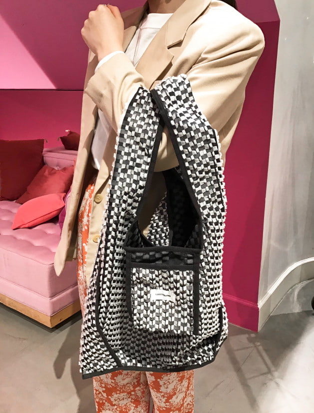 若干持ち手が通常のトートバッグより狭めなので、肩周りはすっきりとしたトップスが相性良さそうです。