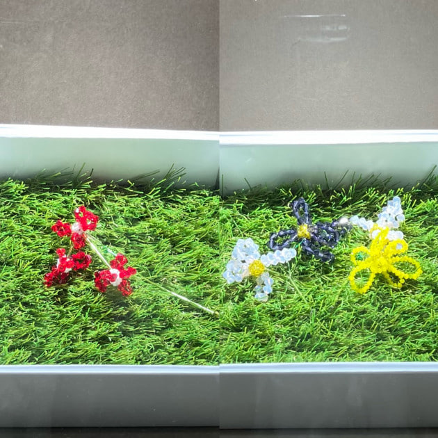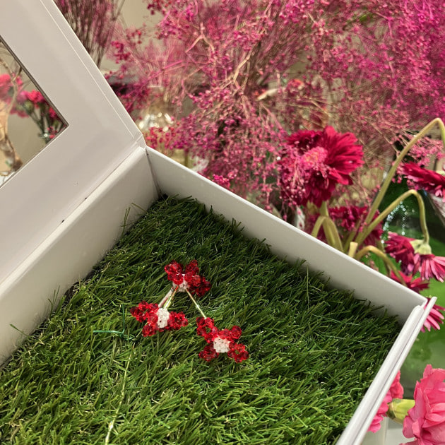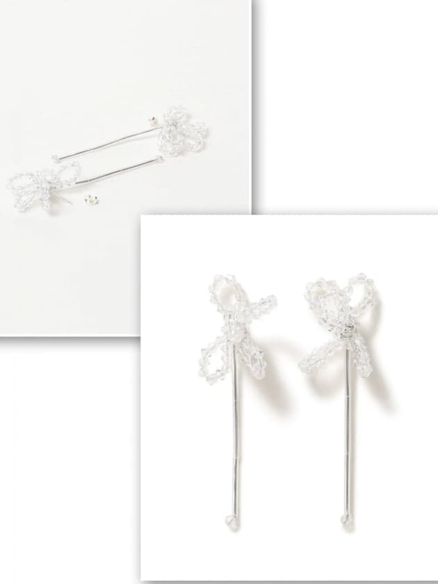 先ずは、〈Chika Kisada〉美しいく繊細なビーズが特徴のキャミソール♡ヘアアクセサリーは、〈HELENA THULIN〉のシルバーとレッドお花モチーフで華やかさをプラス♡