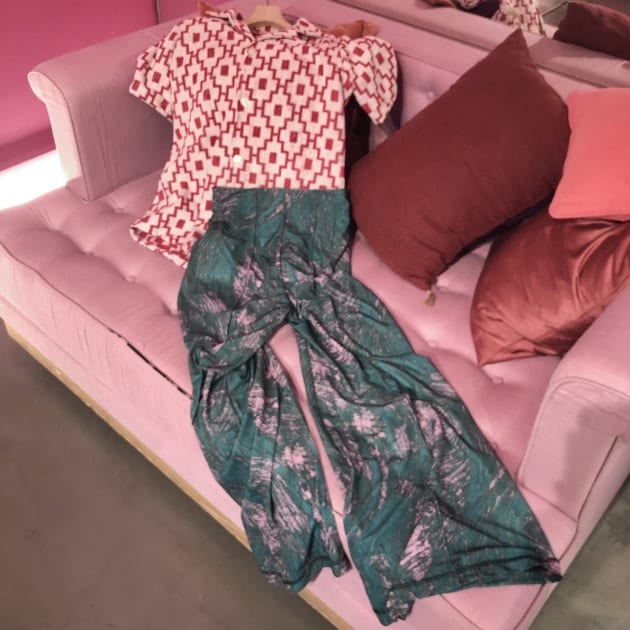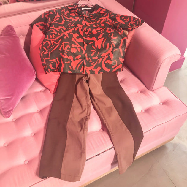 スタイリングは、マツモトです。水玉のセットアップに、〈Vermeerist BEAMS〉のアイコンボウブラウス。柄×柄合わせです。可愛いです♡