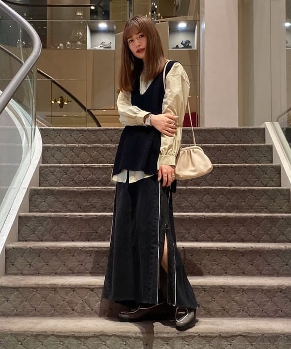 ボウタイ付きトップスをインして、<maturely>のマーメイドスカートを。